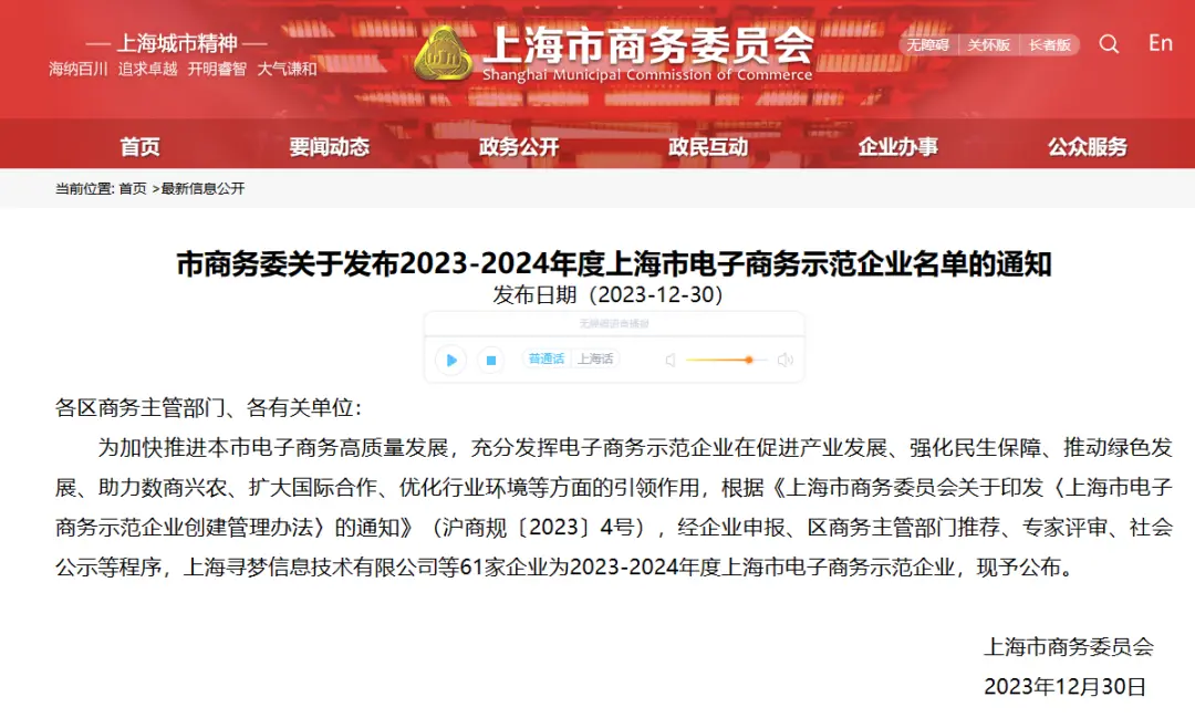 2024年1月2日,上海市商务委员会公布了“2023-2024年度上海市电子商务示范企业”名单。